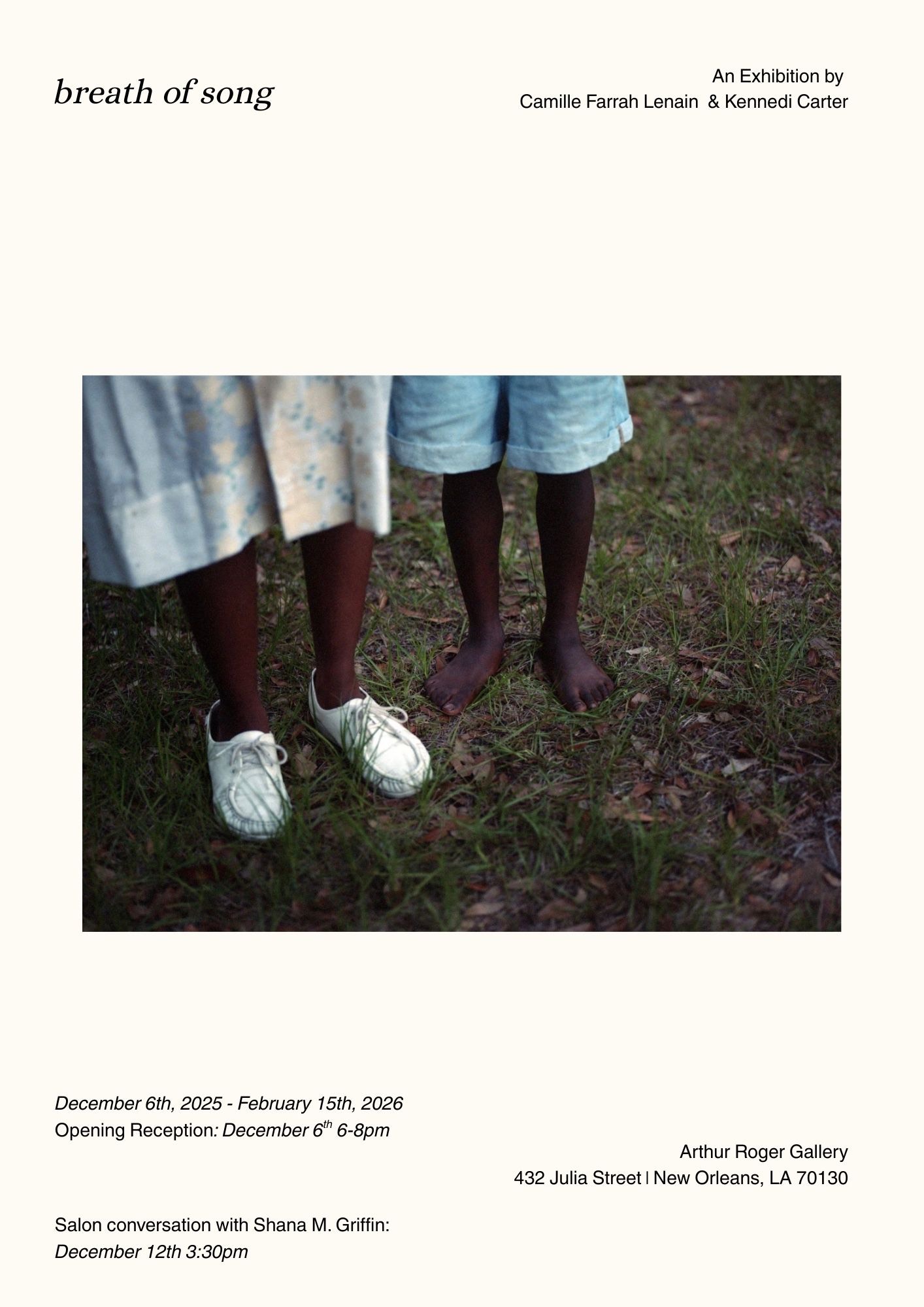 “breath of song” is a joint exhibition featuring Camille Farrah Lenain, our 2024 Michael P. Smith Fund for Documentary Photography winner, and Kennedi Carter, our 2024 PhotoNOLA Review Prize winner. Their work in conversation offers two distinct approaches to portraiture, narrative, and the evolving language of photographic storytelling. This exhibition will be hosted at Arthur Roger Gallery, with an opening reception on December 6th at 6pm, and a salon conversation with the artists Shana M. Griffen on December 12th at 3:30pm.